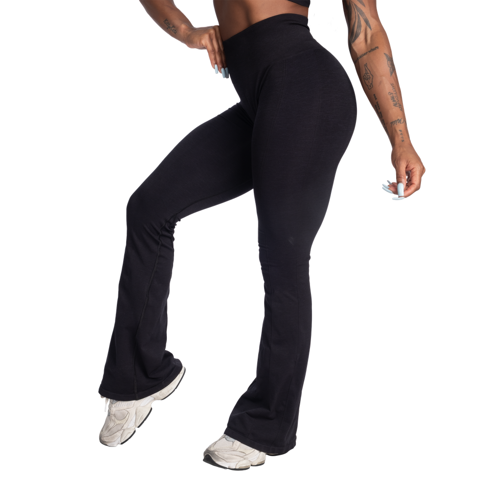 Features: Seamless construction, soft hand feel, ribbed waistband, scrunch at back, flared leg opening